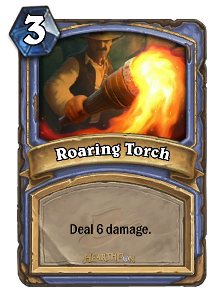 Наносит 3 ед. урона. Положите в колоду заклинание ‘Roaring Torch’, которое нанесет 6 ед. урона.