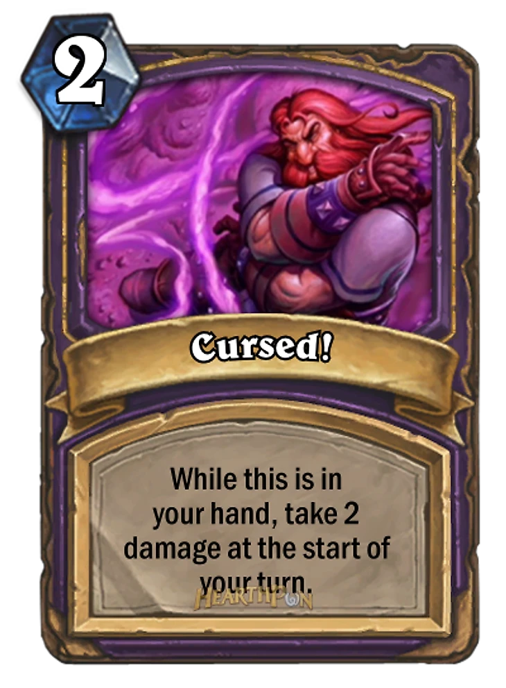 Даете оппоненту карту ‘Cursed’. Пока она находится у него в руке, он получает 2 урона в свой ход.