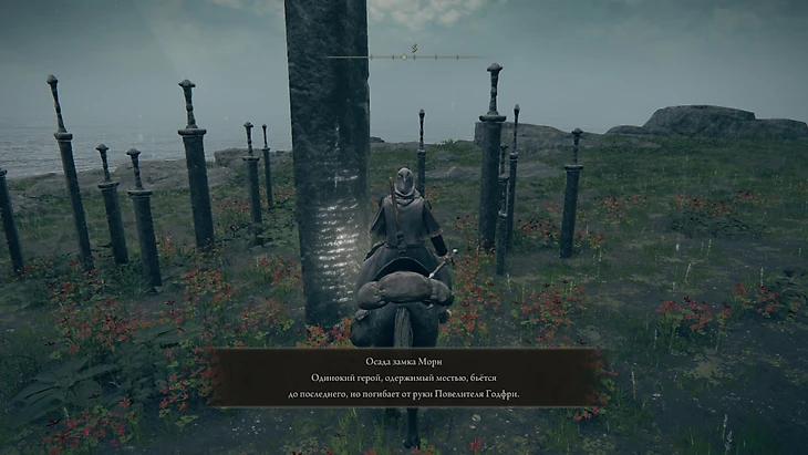 На мемориале написано: «Осада замка Морн. Одинокий герой, одержимый местью, бьется до последнего, но погибает от руки Повелителя Годфри».