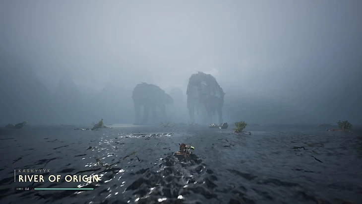 В начале демки главный герой оказывается в реке, по которой шагают штурмовые роботы Империи. Как можно увидеть, Джедай будет не только лазать по лианам и бегать по стенам, но и плавать.