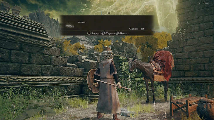 Но самый главный мем Elden Ring – слово «собака». Абсурдное послание оставляли около вьючных ослов торговцев еще до выхода игры, и оно быстро развирусилось. Записки встречаются даже в удаленных локациях, они моментально собирают лайки от игроков. Моя, например, набрала 26 положительных оценок меньше чем за полчаса.