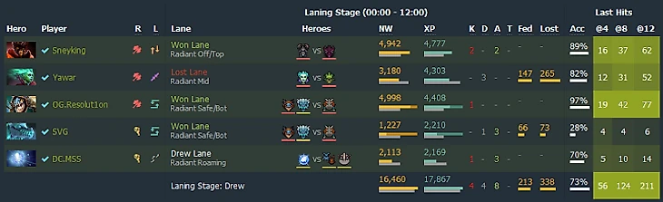 По всем показателям Явар и Резоль далеко впереди. Но есть небольшой временной отрезок, когда Снейкингу все-таки удается ненадолго стать керри. Речь идет о первых двенадцати минутах игры.