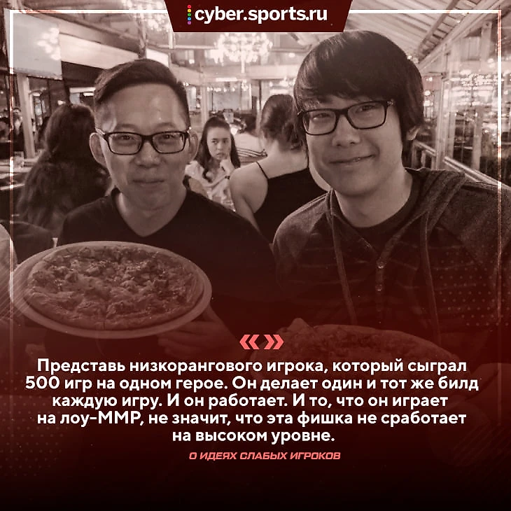 – Представь низкорангового игрока, который сыграл 500 игр на одном герое. Он делает один и тот же билд каждую игру. И он работает. Или он повторяет одни и те же действия, или знает ровно одну фишку. И то, что он играет на лоу-ММР, не значит, что эта фишка не сработает на высоком уровне. Я считаю, что можно узнать много нового, опять же, у спамеров одного героя или тех, кто постоянно пробует новое.