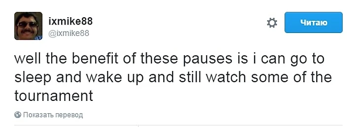 «Ну, польза от этих пауз в том, что я могу пойти поспать и, проснувшись, посмотреть тот же турнир».