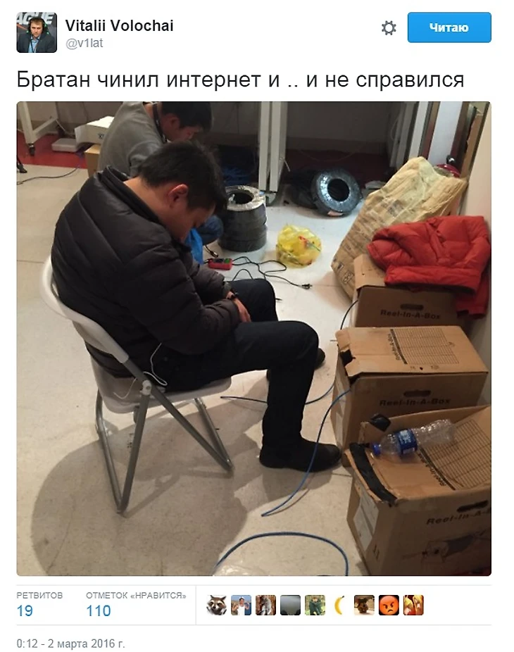 «Нам сказали, что мы «не можем подключить вас к интернету» в студии аналитики. Здесь же провод от локальной сети в 30 шагах от стола. Теперь у нас есть интернет.