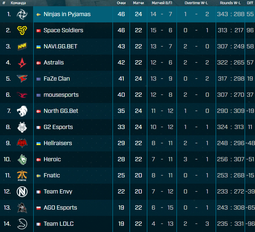 NiP поднялись на первое место в турнирной таблице европейского дивизиона. После 24 сыгранных матчей шведская команда заработала 46 очков, победив в 15 играх. Astralis и Natus Vincere сыграли лишь 22 матча, однако находятся на третьем и четвертом месте соответственно. В активе у Na’Vi сейчас 43 очка, а у Astralis – 42.