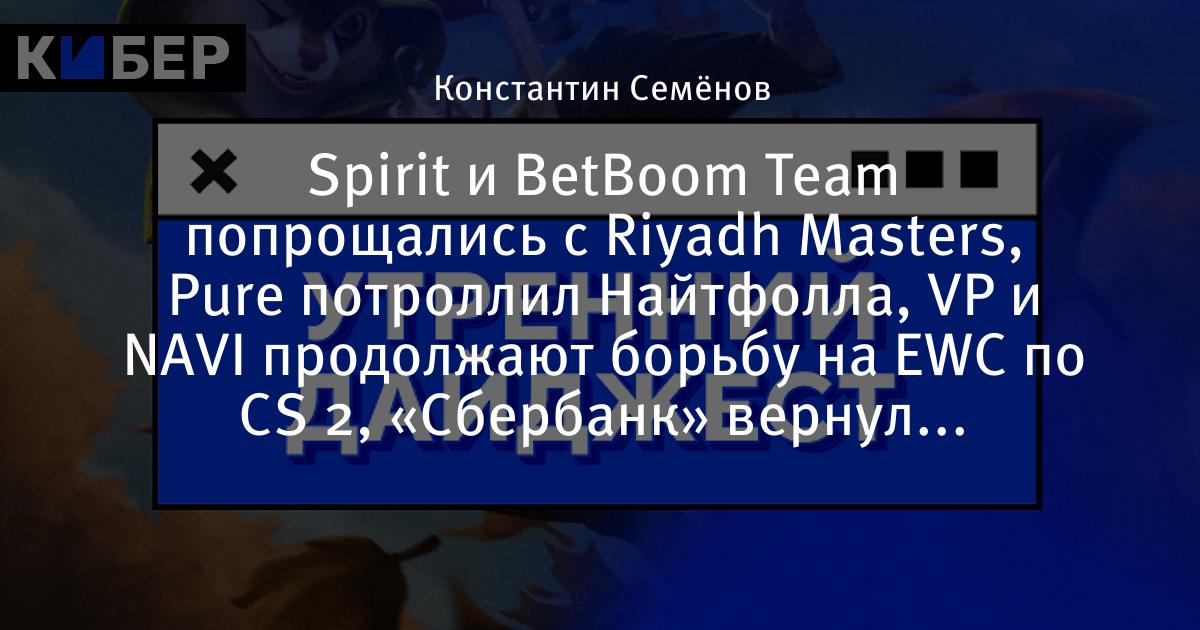 Spirit и BetBoom Team попрощались с Riyadh Masters, Pure потроллил Найтфолла, VP и NAVI продолжают борьбу на EWC по CS 2, «Сбербанк» вернул пополнение в Steam в рублях и другие новости утра