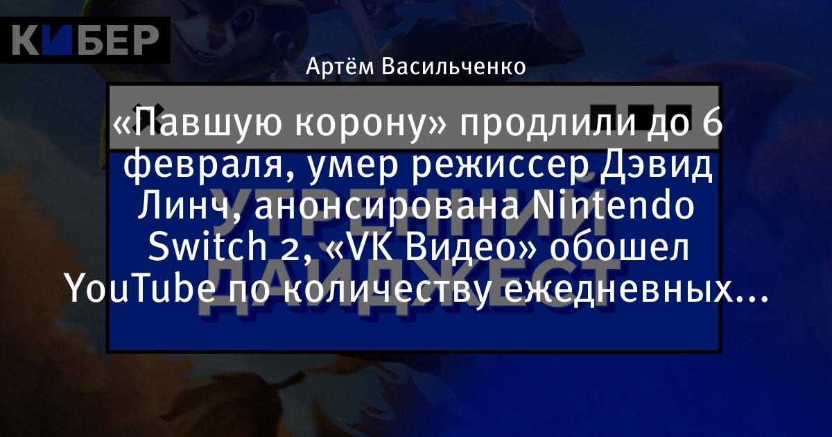 «Павшую корону» продлили до 6 февраля, умер режиссер Дэвид Линч, анонсирована Nintendo Switch 2, «VK Видео» обошел YouTube по количеству ежедневных пользователей и другие новости утра