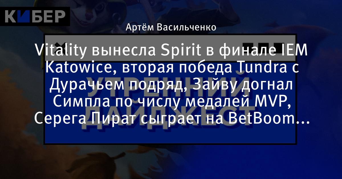 Vitality вынесла Spirit в финале IEM Katowice, вторая победа Tundra с Дурачьем подряд, Зайву догнал Симпла по числу медалей MVP, Серега Пират сыграет на BetBoom Streamers Battle и другие новости утра
