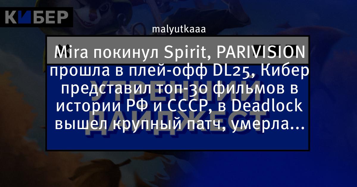 Mira покинул Spirit, PARIVISION прошла в плей-офф DL25, Кибер представил топ-30 фильмов в истории РФ и СССР, в Deadlock вышел крупный патч, умерла Мишель Трахтенберг и другие новости