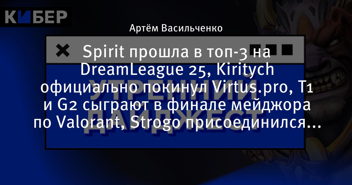 Spirit прошла в топ-3 на DreamLeague 25, Kiritych официально покинул Virtus.pro, T1 и G2 сыграют в финале мейджора по Valorant, Strogo присоединился к Aurora и другие новости утра