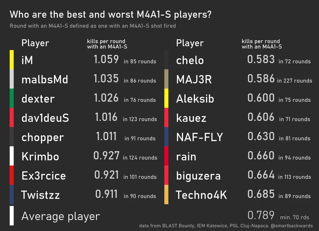 В топ-3 игроков с M4A1-S вошли Иван «iM» Михай из NAVI (1,05), Марио «MalbsMd» Самаоя из G2 (1,03) и Крис «dexter» Нонг из FlyQuest (1,02).