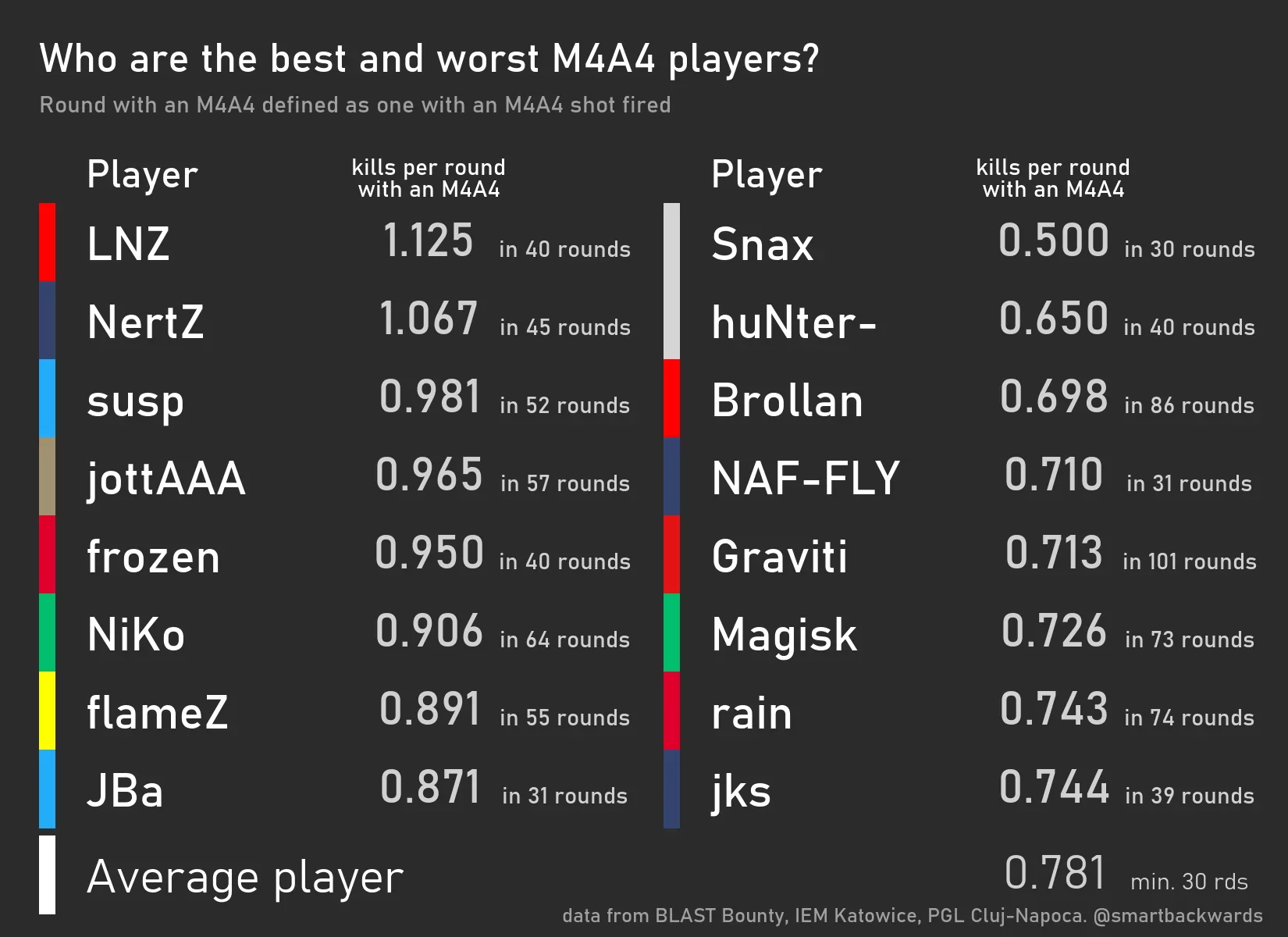 В топ-3 игроков с M4a4 вошли Линус «LNZ» Холтанг из Heroic (1,12), Гай «NertZ» Илуз из Liquid (1,06) и Тим «Susp» Анстрем из Wildcard (0,98).