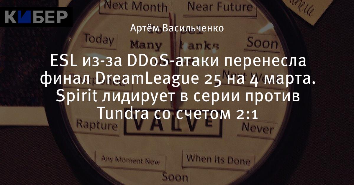 ESL из-за DDoS-атаки перенесла финал DreamLeague 25 на 4 марта. Spirit лидирует в серии против Tundra со счетом 2:1