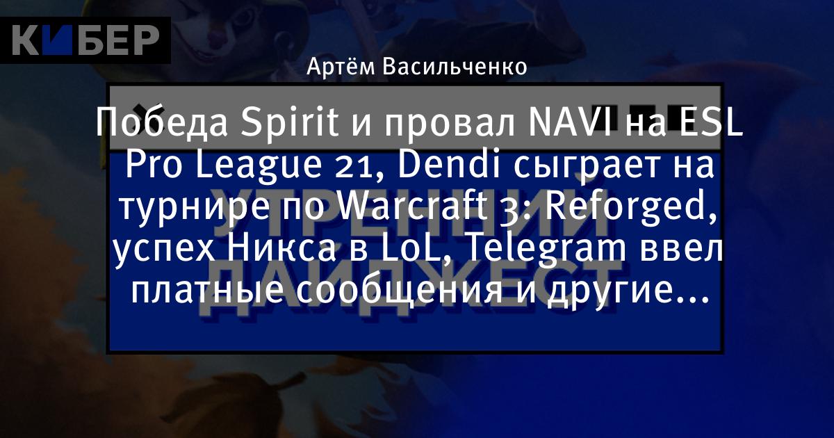 Победа Spirit и провал NAVI на ESL Pro League 21, Dendi сыграет на турнире по Warcraft 3: Reforged, успех Никса в LoL, Telegram ввел платные сообщения и другие новости утра