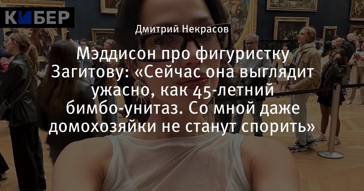 «Фигуристка Загитова это же вообще ужас какой-то. У нее от природы такая утонченная красота, реально, девчонка была просто восхитительная, именно от природы. Я как бы знаю, с кем она встречается – с супергигаолигархами. Видимо, у них есть эта тема, что их телки должны выглядеть как проапгрейженный бимбо-унитаз. Понятно, что Загитова не большого ума, она спортсменка и вообще, но господи… Сейчас она выглядит просто ужасно, как 45-летний бимбо-унитаз. Думаю, со мной даже домохозяйки не станут спорить», – высказался стример Илья Мэддисон.