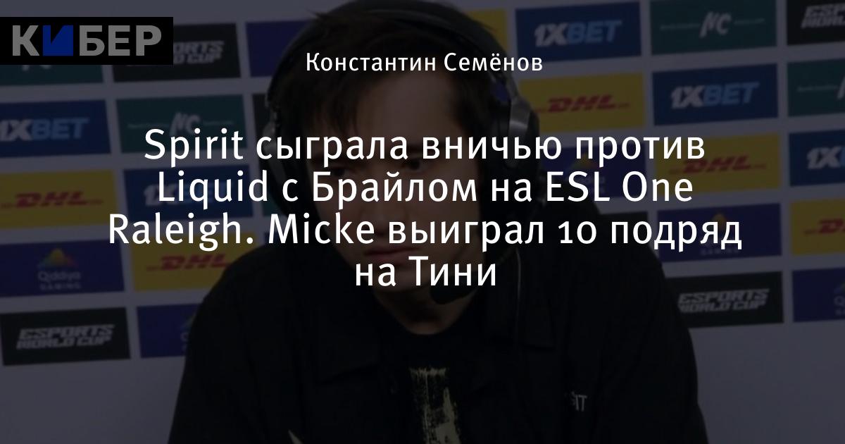 Spirit сыграла вничью против Liquid с Брайлом на ESL One Raleigh. Micke выиграл 10 подряд на Тини