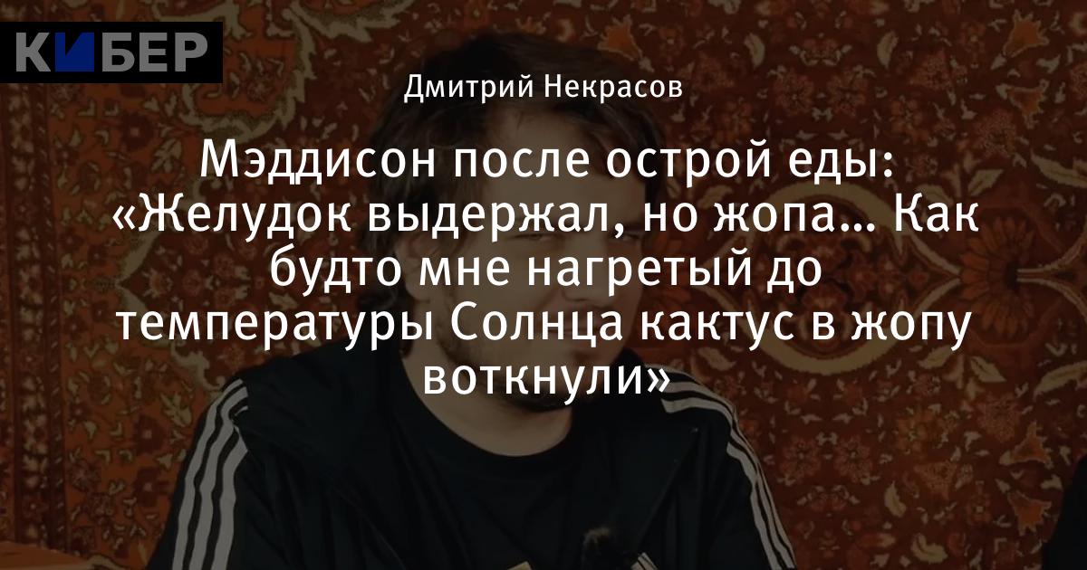 Мэддисон после острой еды: «Желудок выдержал, но жопа… Как будто мне нагретый до температуры Солнца кактус в жопу воткнули»