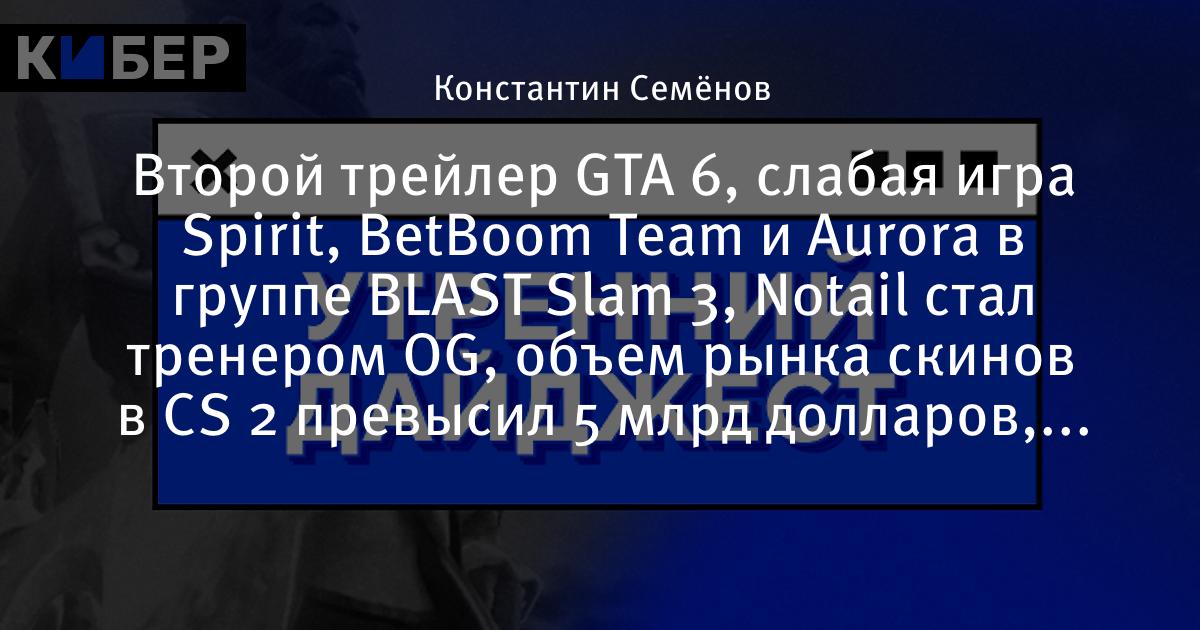Второй трейлер GTA 6, слабая игра Spirit, BetBoom Team и Aurora в группе BLAST Slam 3, N0tail стал тренером OG, объем рынка скинов в CS 2 превысил 5 млрд долларов, экранизация Elden Ring и другие новости утра