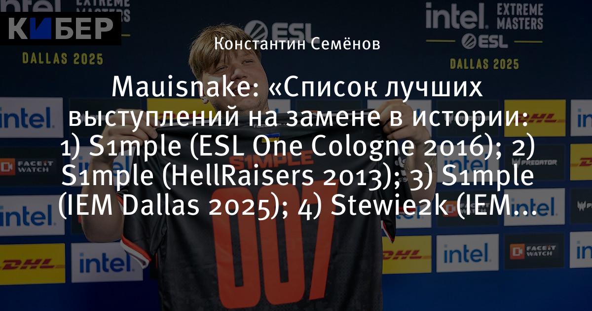 Mauisnake: «Список лучших выступлений на замене в истории: 1) S1mple (ESL One Cologne 2016); 2) S1mple (HellRaisers 2013); 3) S1mple (IEM Dallas 2025); 4) Stewie2k (IEM Dallas 2024)»