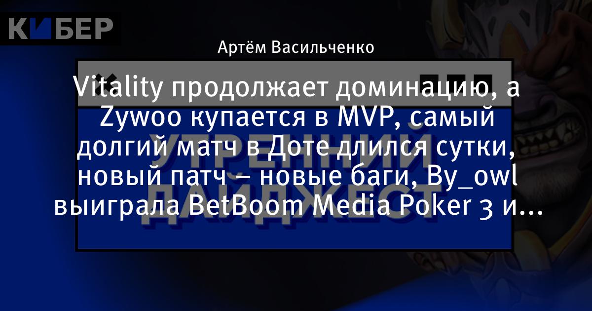 Vitality продолжает доминацию, а Zywoo купается в MVP, самый долгий матч в Доте длился сутки, новый патч – новые баги, By_owl выиграла BetBoom Media Poker 3 и другие новости утра