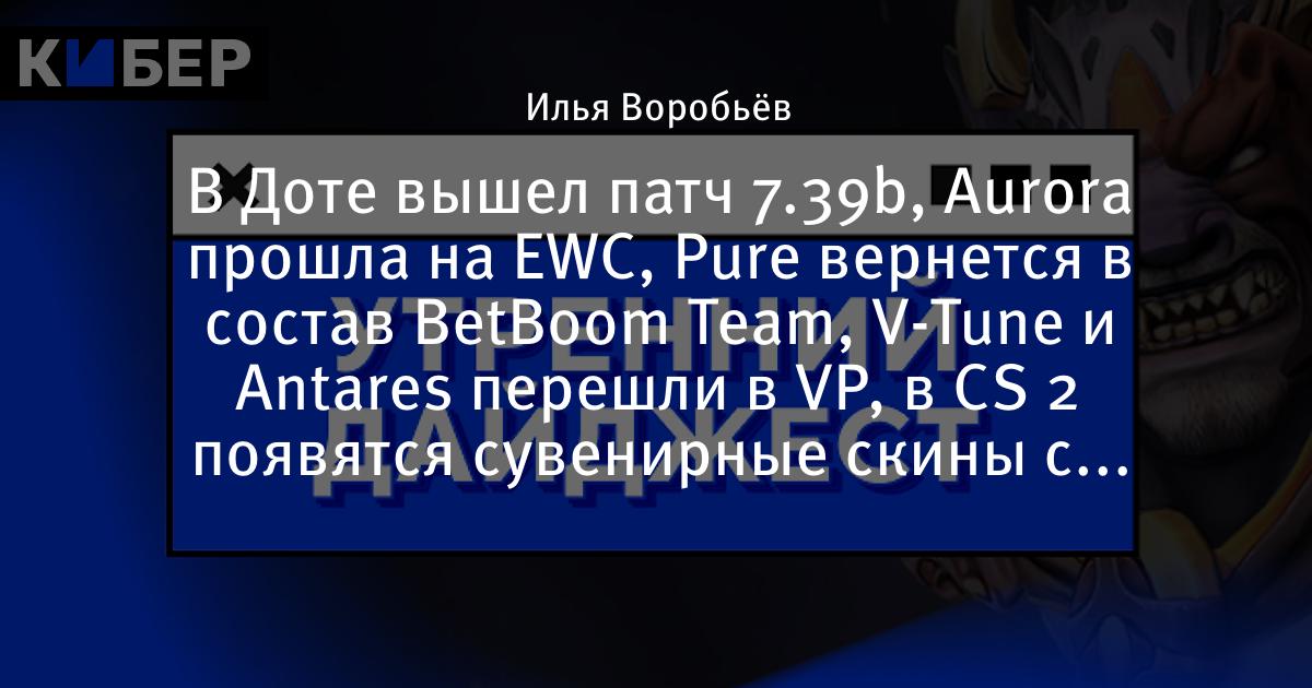 В Доте вышел патч 7.39b, Aurora прошла на EWC, Pure вернется в состав BetBoom Team, V-Tune и Antares перешли в VP, в CS 2 появятся сувенирные скины с хайлайтами и другие новости утра