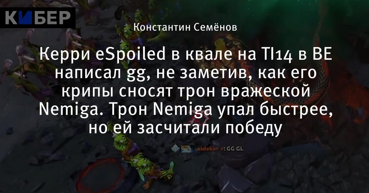 Керри eSpoiled в квале на TI14 в ВЕ написал gg, не заметив, как его крипы сносят трон вражеской Nemiga. Трон Nemiga упал быстрее, но ей засчитали победу