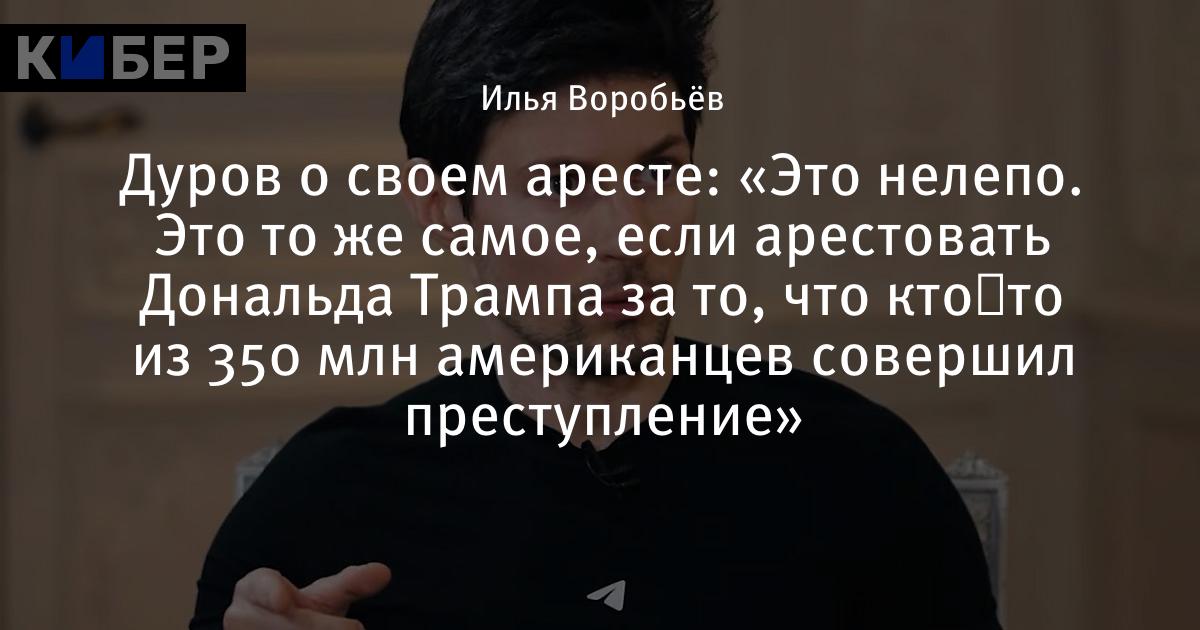 Дуров о своем аресте: «Это нелепо. Это то же самое, если арестовать Дональда Трампа за то, что кто‑то из 350 млн американцев совершил преступление»