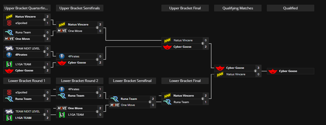 - 19:00 Cyber Goose 2:0 4Pirates / верхняя сетка