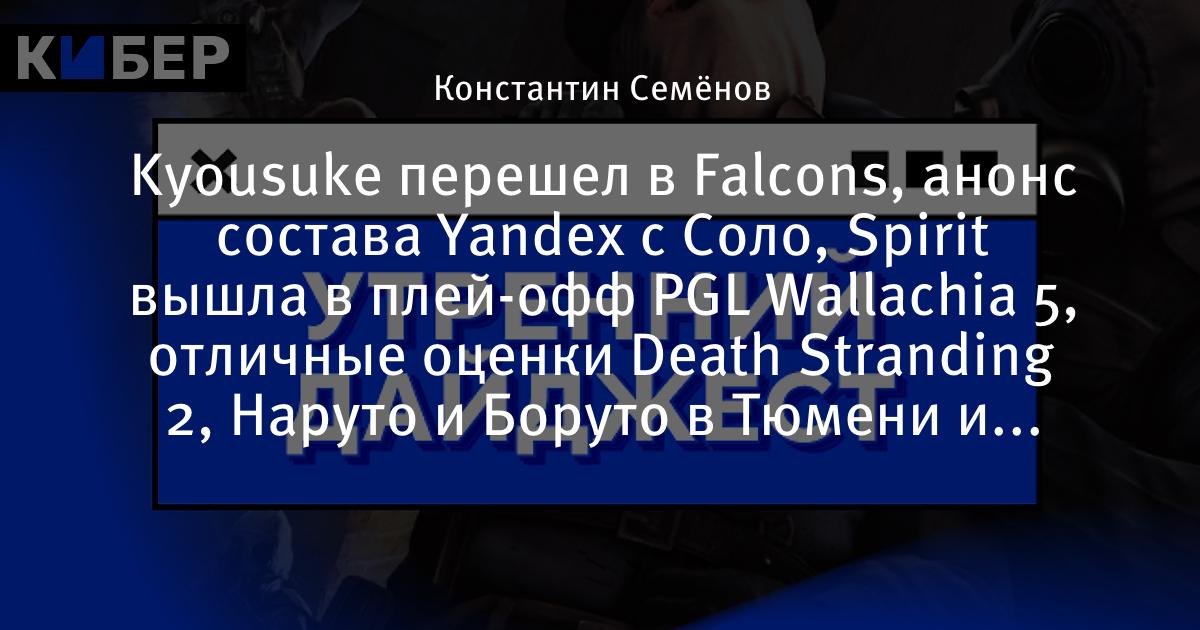 Kyousuke перешел в Falcons, анонс состава Yandex с Соло, Spirit вышла в плей-офф PGL Wallachia 5, отличные оценки Death Stranding 2, Наруто и Боруто в Тюмени и другие новости утра