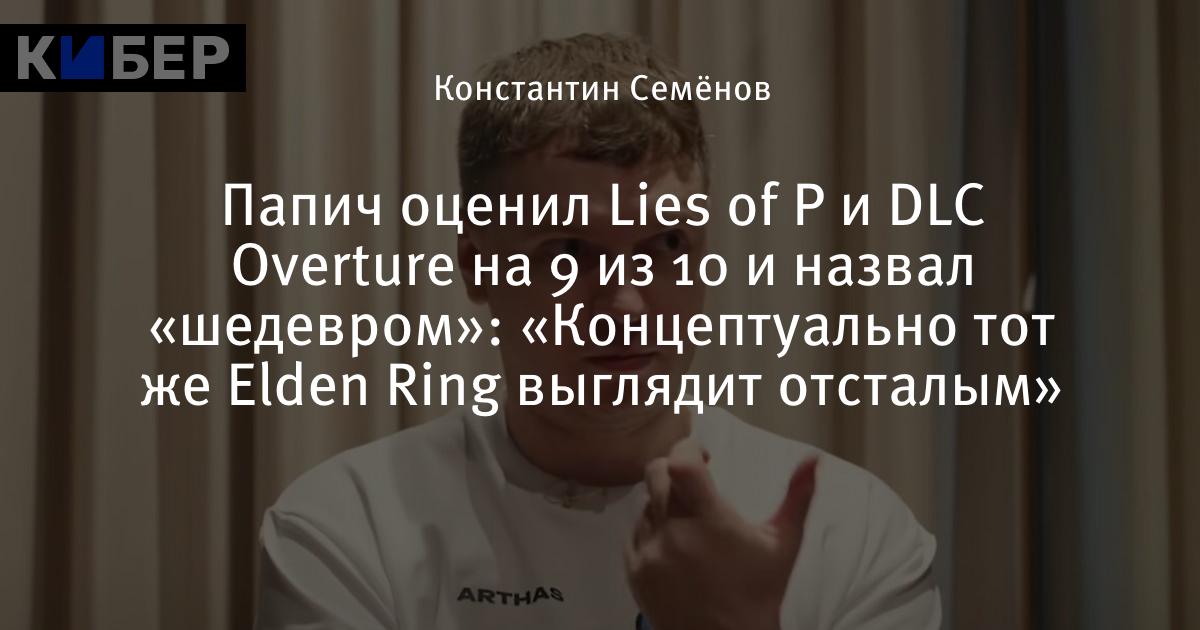 Моя итоговая оценка Lies of P + Overture – 9 из 10, шедевр современной игровой индустрии и не только. Игра, которую не превзойдут в данном жанре как минимум ближайшие 3+ года. Разве что, возможно, та же компания. После дополнения к Элдену, а потом Nightreign, лично я от Бабадзаки не ожидаю ничего достойного. [...] Не только визуально, но и концептуально тот же Elden Ring выглядит отсталой игрой по сравнению с вышеописанным шедевром. Как будто между ними лет так на 8 пропасть», – сравнил Папич в своем телеграм-канале.