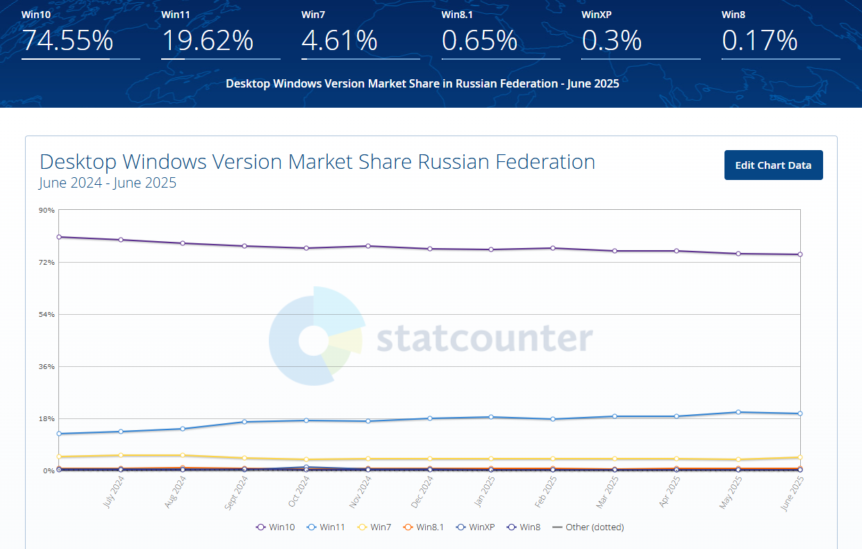 Показатели по миру отличаются от данных по России – на территории Российской Федерации почти 75% пользователей предпочитают Windows 10, тогда как на Windows 11 приходится менее 20%.