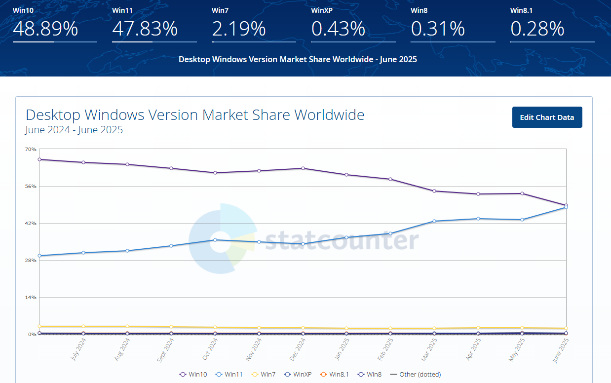 На данный момент 47,83% пользователей предпочитают Windows 11, тогда как на Windows 10 приходится 48,89% пользователей.