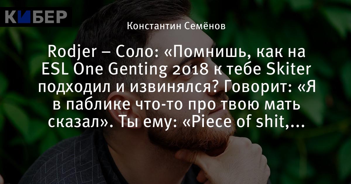 Rodjer – Соло: «Помнишь, как на ESL One Genting 2018 к тебе Skiter подходил и извинялся? Говорит: «Я в паблике что-то про твою мать сказал». Ты ему: «Piece of shit, #######»