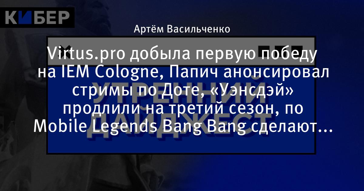 Virtus.pro добыла первую победу на IEM Cologne, Папич анонсировал стримы по Доте, «Уэнсдэй» продлили на третий сезон, по Mobile Legends Bang Bang сделают аниме и другие новости утра