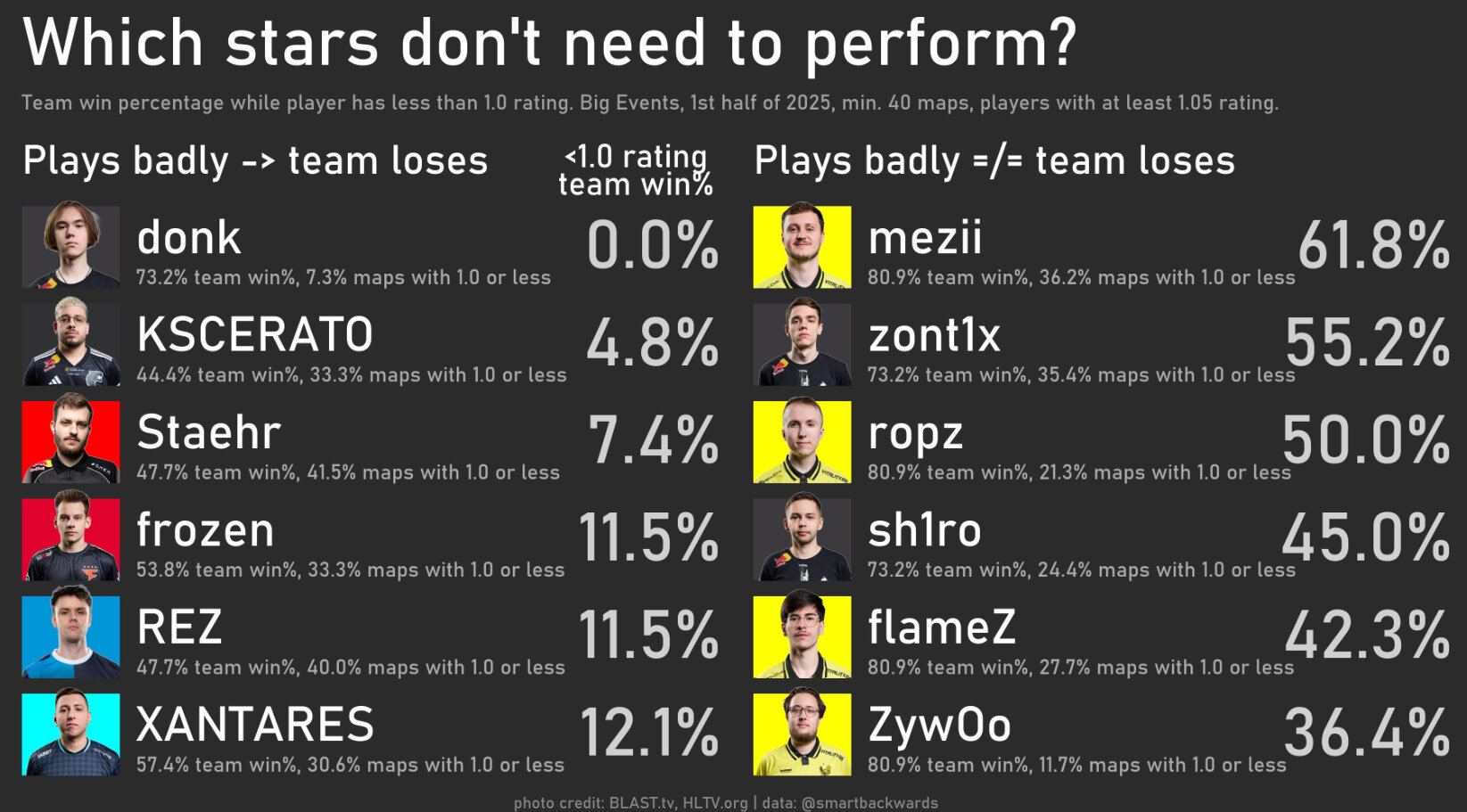 Статистика была взята за первую половину 2025 года. В ней учитывались топ-турниры, игроки с минимум 40 картами на таких турнирах и рейтингом HLTV больше 1,05.