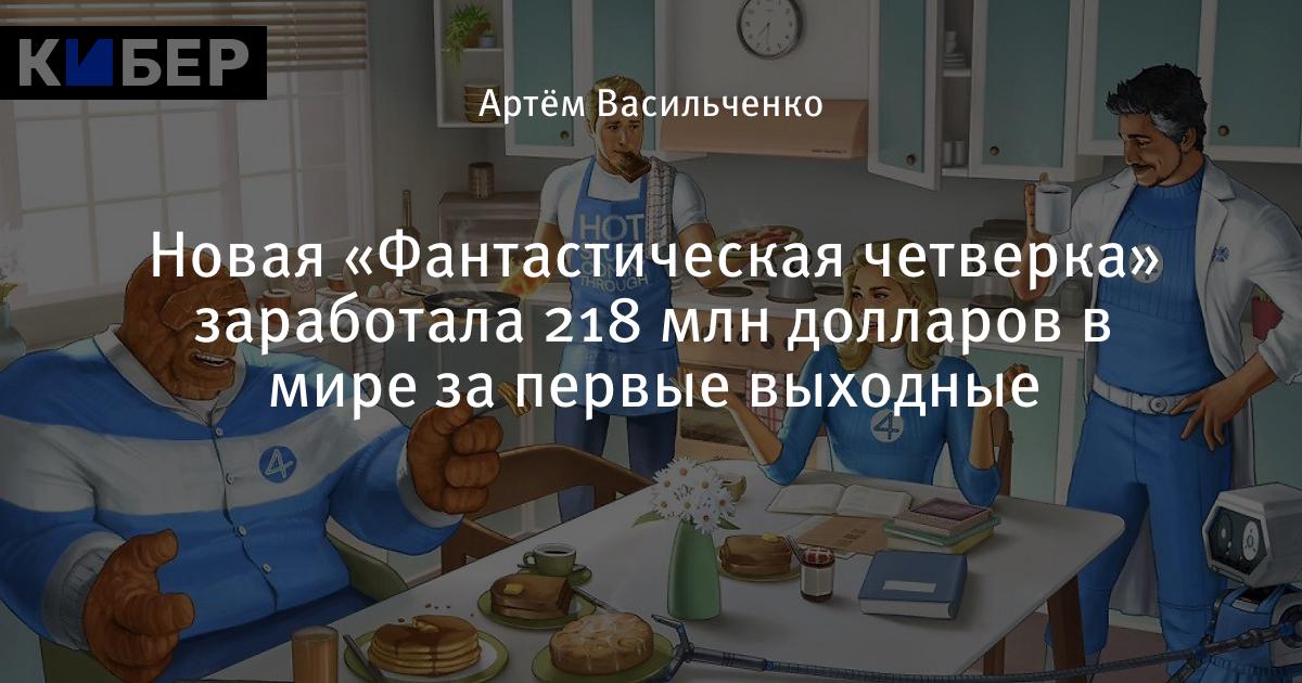 Новая «Фантастическая четверка» в мировом прокате собрала 218 млн долларов (Кибер: 118 млн в США, 100 млн – в других странах) за первые выходные. Это лучший старт в истории франшизы без учета инфляции.