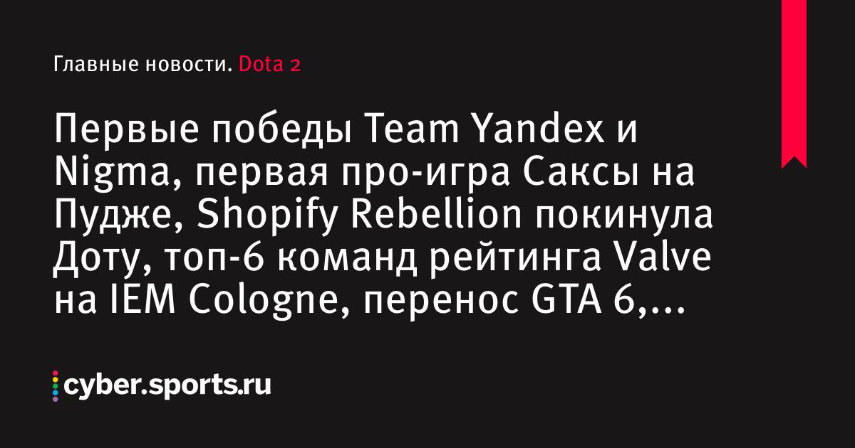Первые победы Team Yandex и Nigma, первая про-игра Саксы на Пудже, Shopify Rebellion покинула Доту, топ-6 команд рейтинга Valve на IEM Cologne, перенос GTA 6, трейлер «Зверополиса 2» и другие новости утра