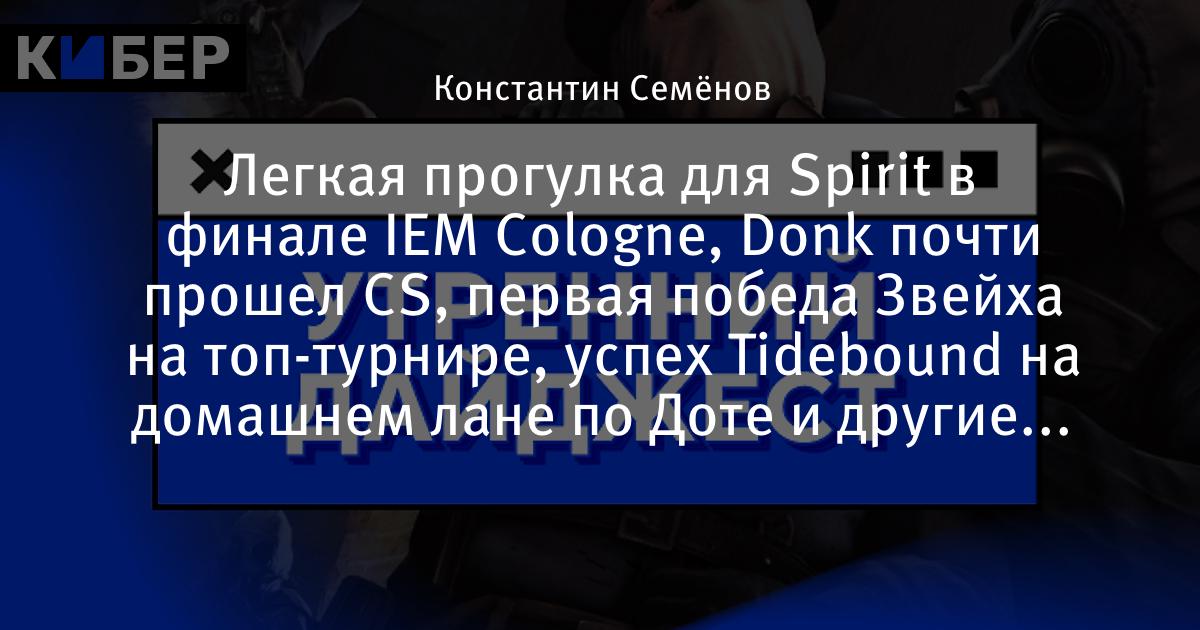 Легкая прогулка для Spirit в финале IEM Cologne, Donk почти прошел CS, первая победа Звейха на топ-турнире, успех Tidebound на домашнем лане по Доте и другие новости утра