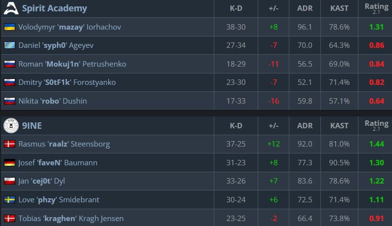 Серия стала первой для 16-летнего Владимира «Mazay» Ергачева на HLTV и за Spirit Academy. Игрок стал единственным в своей команде, кто закончил матч в плюсе по KD – 38-30.