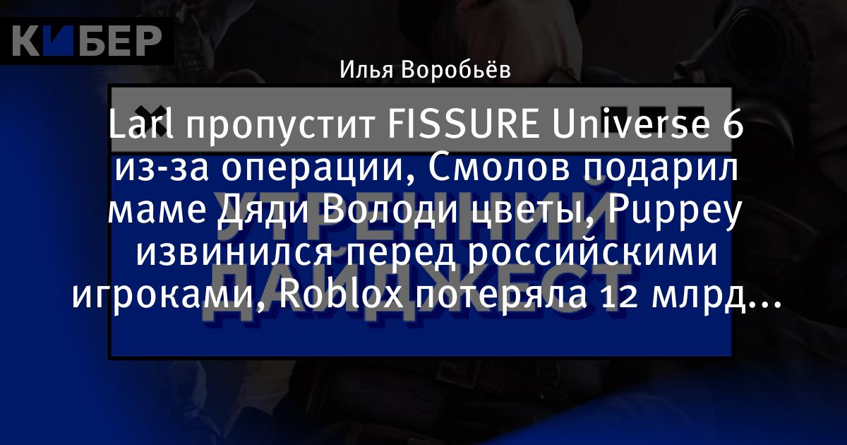 Larl пропустит FISSURE Universe 6 из-за операции, Смолов подарил маме Дяди Володи цветы, Puppey извинился перед российскими игроками, Roblox потеряла 12 млрд долларов и другие новости утра