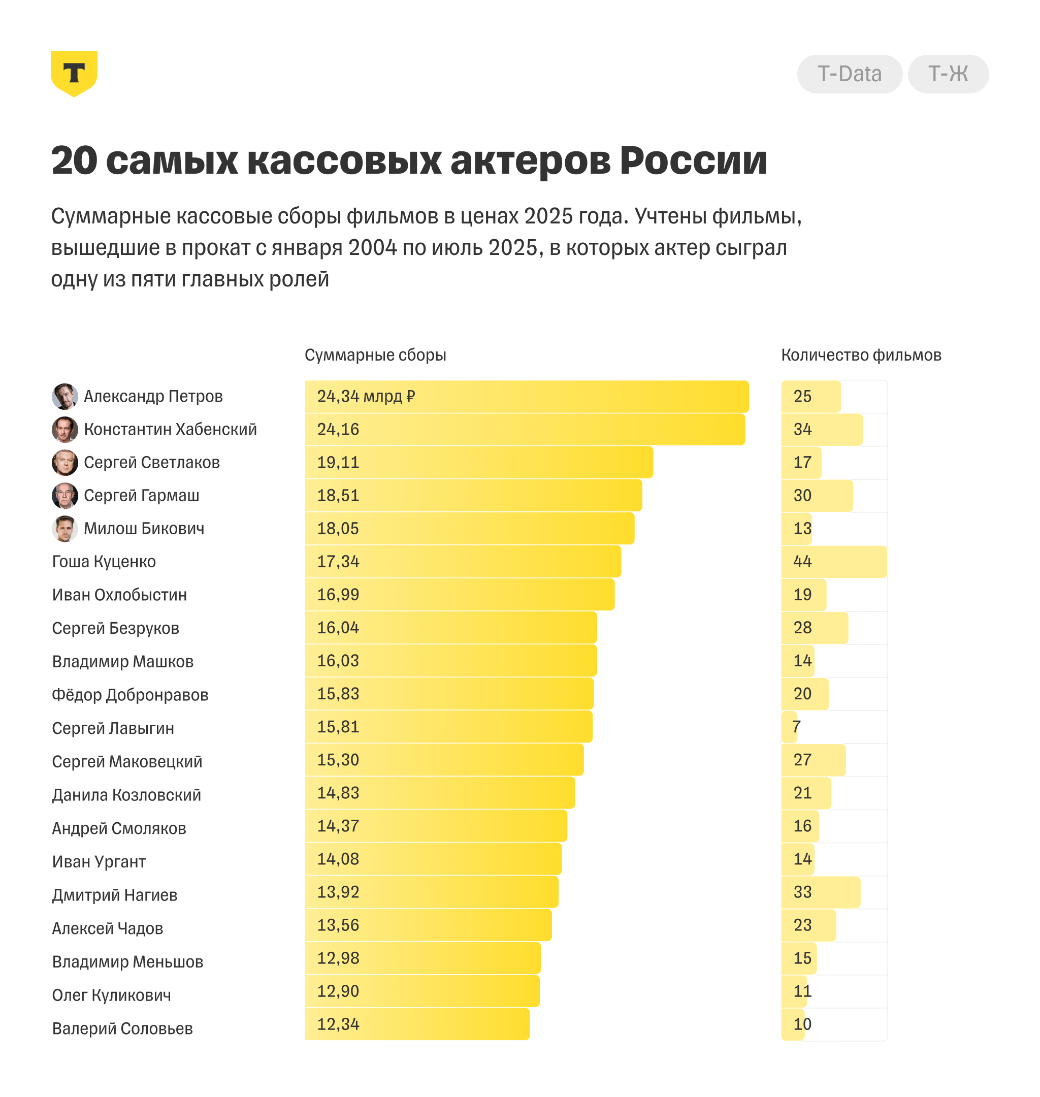 Александр Петров и Константин Хабенский вошли в список самых кассовых российских актеров за последние 20 лет