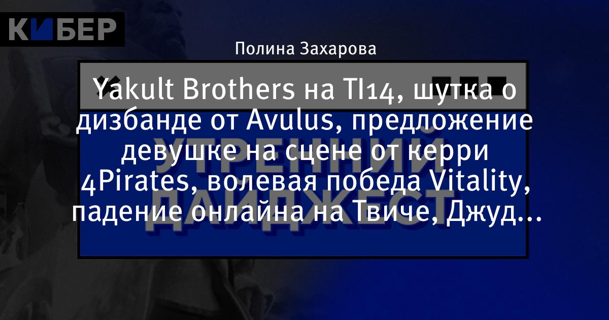 Yakult Brothers на TI14, шутка о дизбанде от Avulus, предложение девушке на сцене от керри 4Pirates, волевая победа Vitality, падение онлайна на Твиче, Джуд Лоу в роли Владимира Путина и другие новости утра