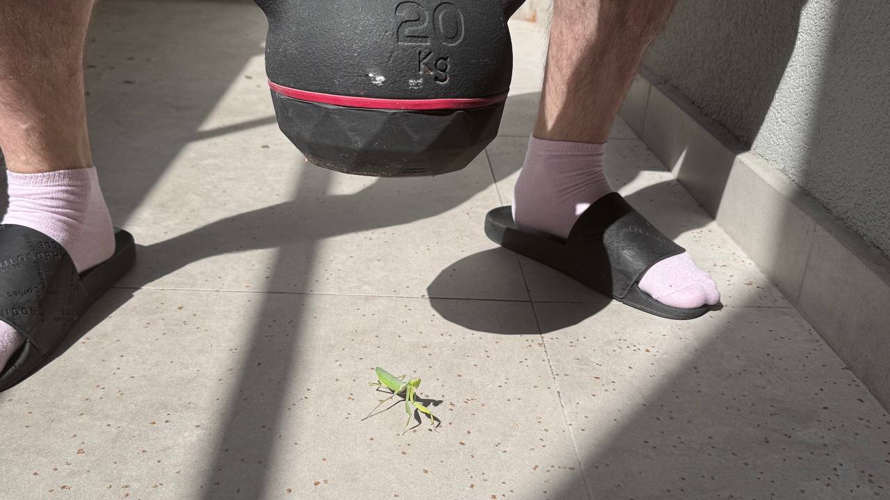 В своем телеграм-канале Дмитрий «Korb3n» Белов выложил фото богомола, над которым виднеется 20-килограммовая гиря.