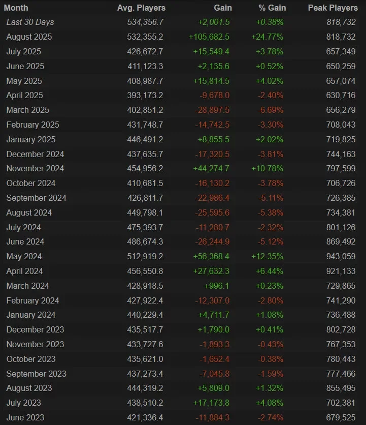 Кроме того, в августе пиковый онлайн составил 818 тысяч игроков, что является самым большим показателем за последний год.