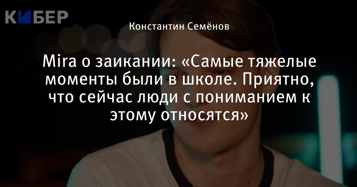 [...] Приятно, что люди с пониманием к этому относятся. Самые тяжелые моменты были в школе, потому что когда ты в школе и ты заика, ты выходишь в доске – очевидно, это фишка детей, они со всего смеются, что не понимают. Было тяжело. В университете было уже с этим легче, потому что там уже были более взрослые люди и понимающие. И сейчас тоже – очень приятно, что люди себя хорошо ведут, с пониманием относятся к каким-то дефектам в людях», – поделился Мирослав «Mira» Колпаков в интервью Марии «Mrs.Marple» Ермолиной.