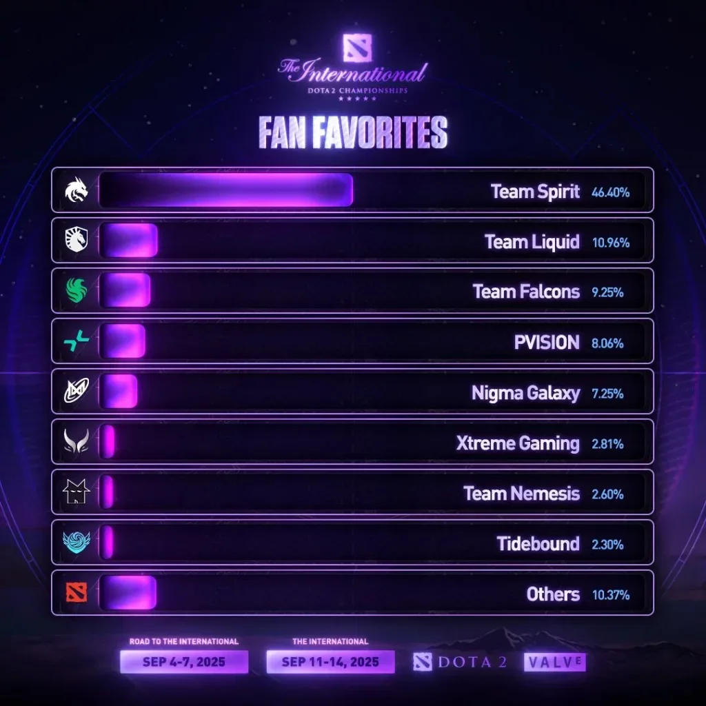 По данным Викрама Редди, в победу Spirit на TI14 верят 46,4% дотеров. Liquid – 2-я по популярности команда – 10,96%, Falcons – 3-я – 9,25%.