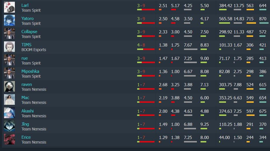 Все 5 игроков Spirit расположились в конце списка. Ниже Александра «Rue» Филина и Ярослава «Miposhka» Найденова – только представители Nemesis, Дениса «Larl» Сигитова, Ильи «Yatoro» Мулярчука и Магомеда «Collapse» Халилова – лишь Тимоти «Tims» Рандрап из Boom.