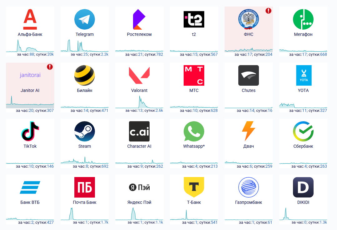 Среди сервисов и приложений утром, 13 сентября, массовые сбои наблюдаются в работе Telegram и Janitor AI.