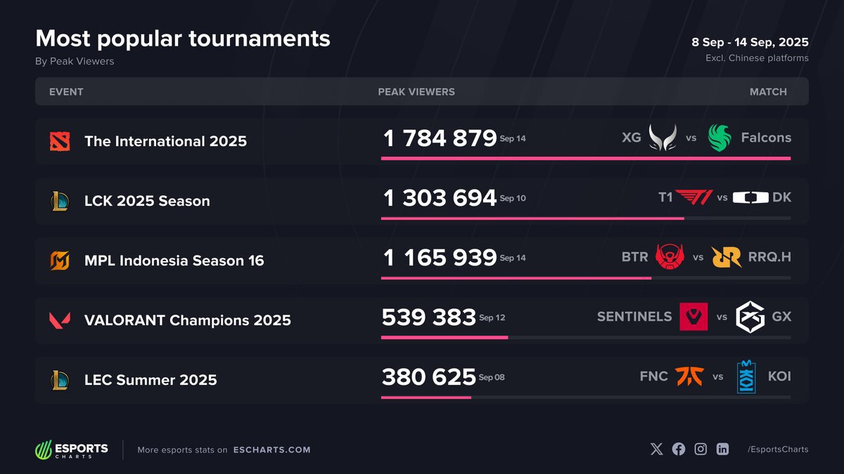 The International 2025 стал самым популярным турниром сентября. На гранд-финале количество зрителей превысило 1,78 млн, что на 31 тысячу больше показателей LCK 2025 по League of Legends.